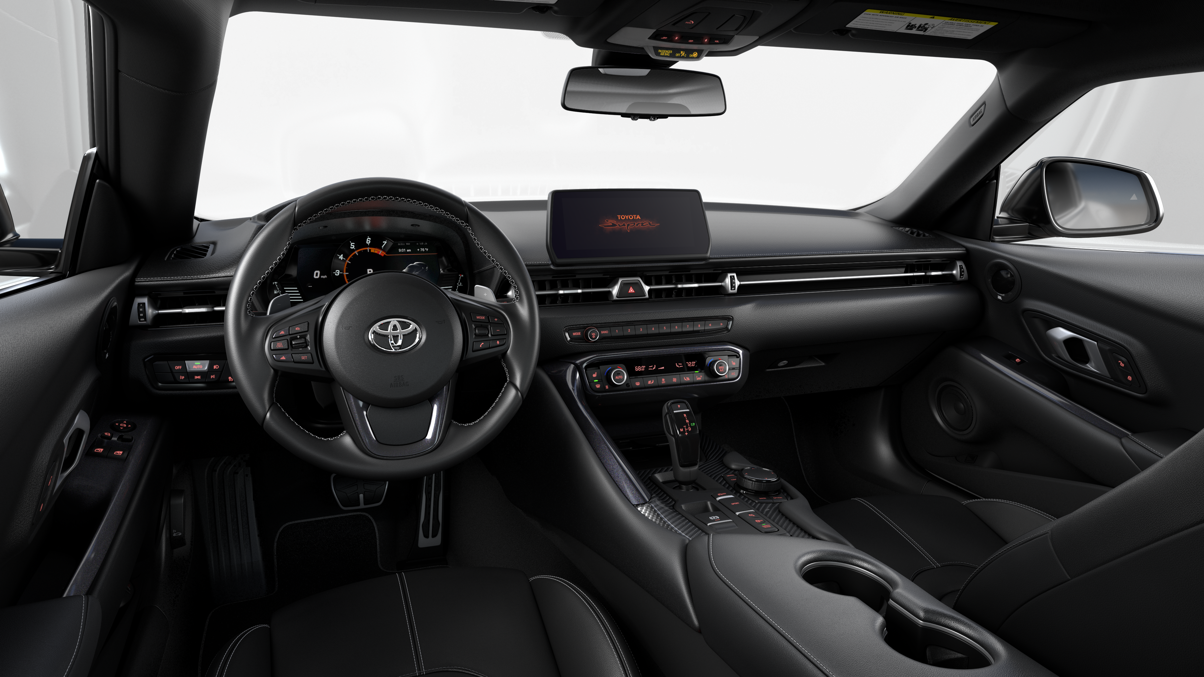 Leather-trimmed sport seats8.8-in. touchscreen with Supra Command featuring touchpad control with navigation, AM/FM, Digital Audio, SiriusXM®, wireless Apple CarPlay® compatible, voice recognition and USB /Bluetooth® connectivity. See toyota.com/connected-services/grsupra-support for details.Toyota Supra Connect featuring Automatic Emergency Calling, Remote-Control Lock/Ventilation, Real-Time Traffic Information, Map Updates, and Toyota Supra Online (services available online; app available for Android and iOS devices) -