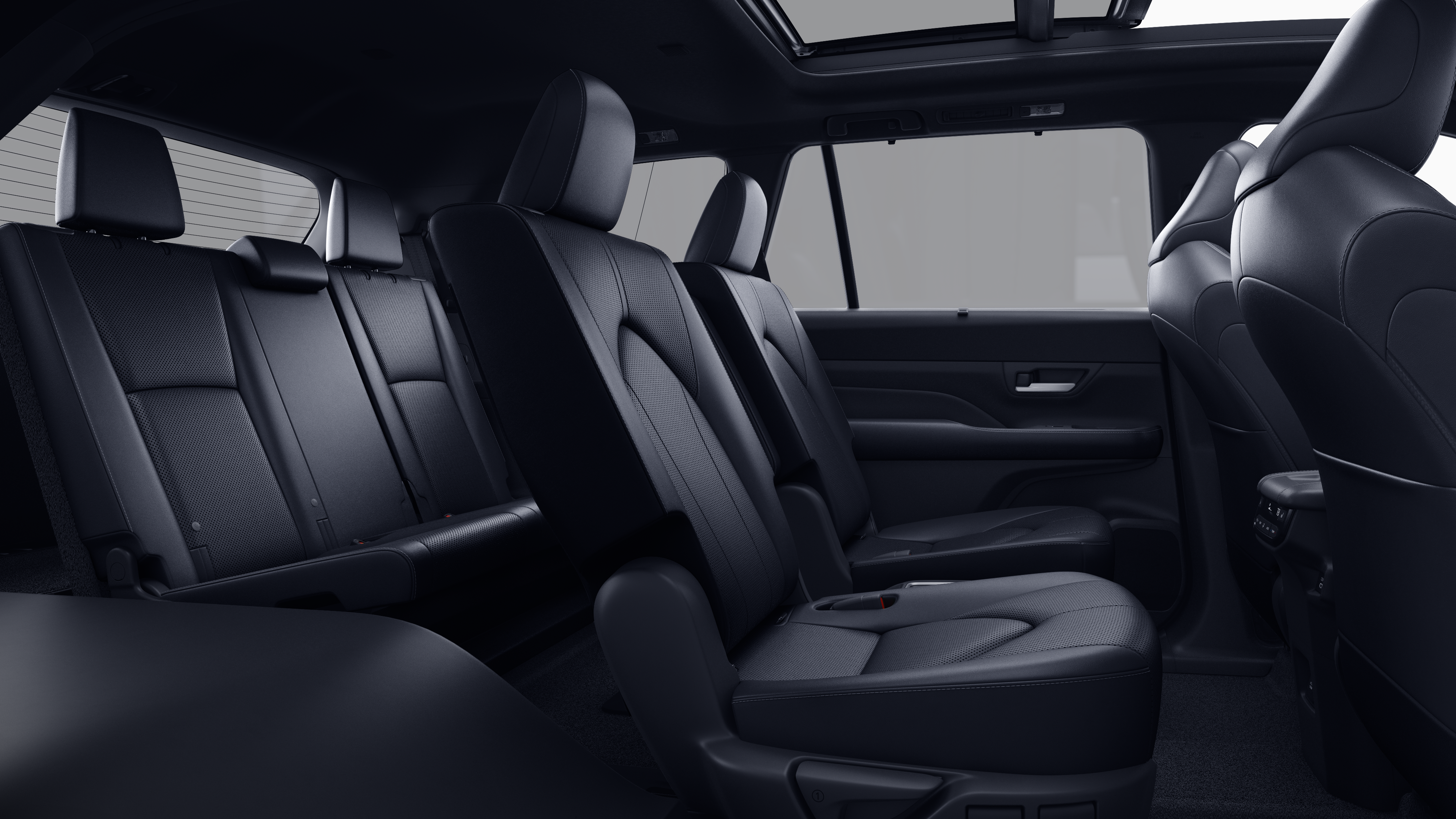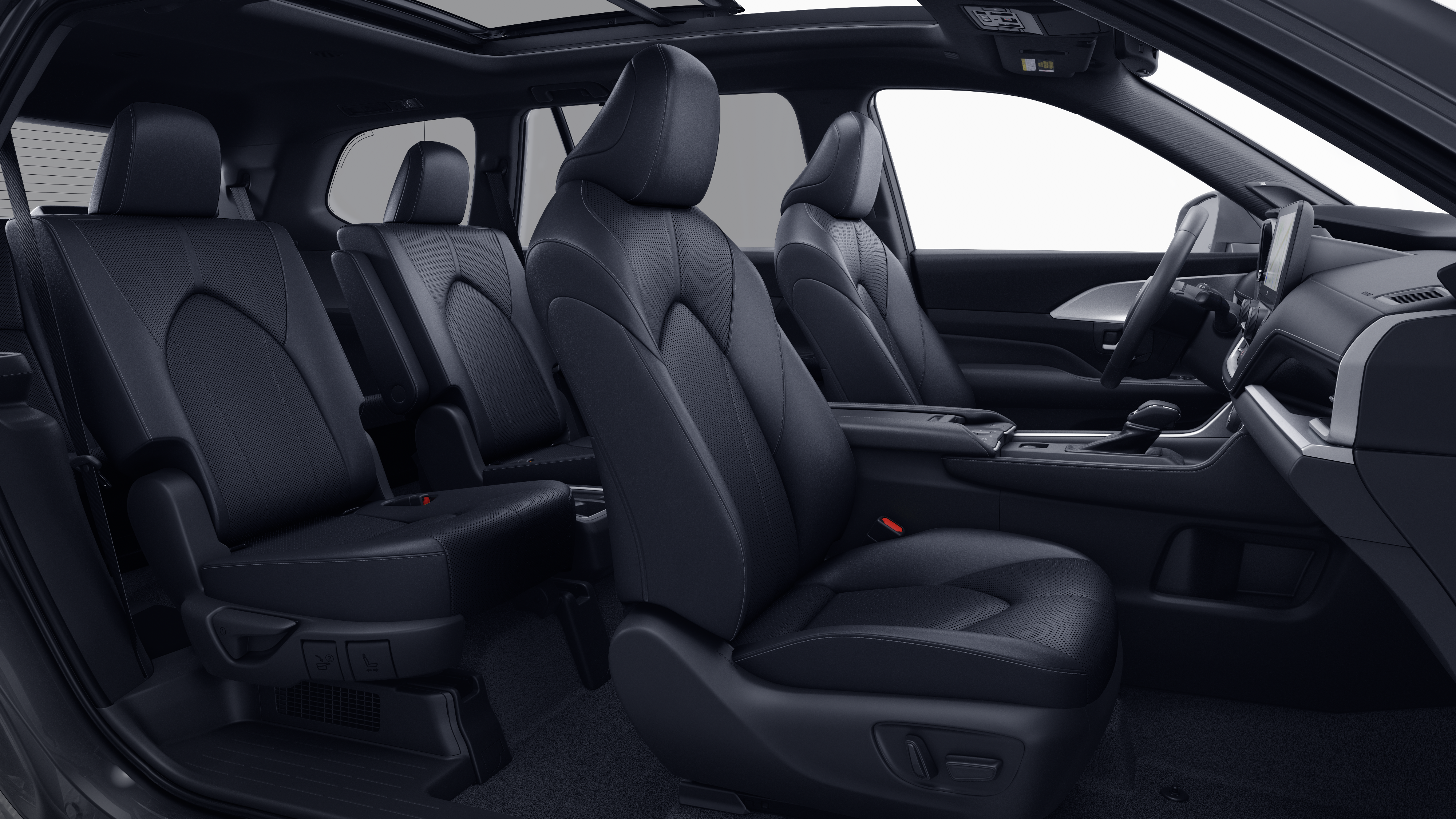 - 7-passenger seating with second-row fold-down captain's chairs and fold-down inboard armrests, adjustable headrests and two cup holders mounted on the floor; and 60/40 split, fold-down third-row seats with sliding headrests and recline function