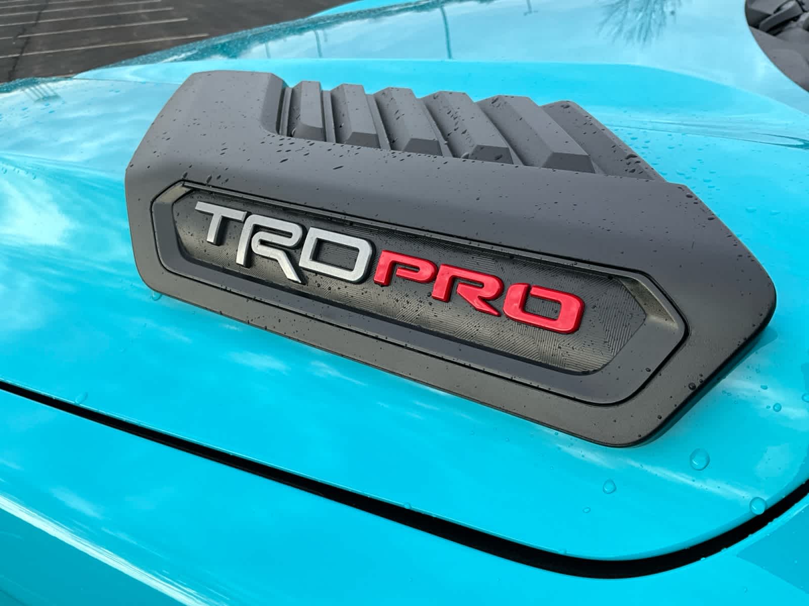- "TRD PRO" hood badge; black door handles; black window molding and mirror caps; black technical-camo-grained tailgate spoiler and overfenders with marker lights